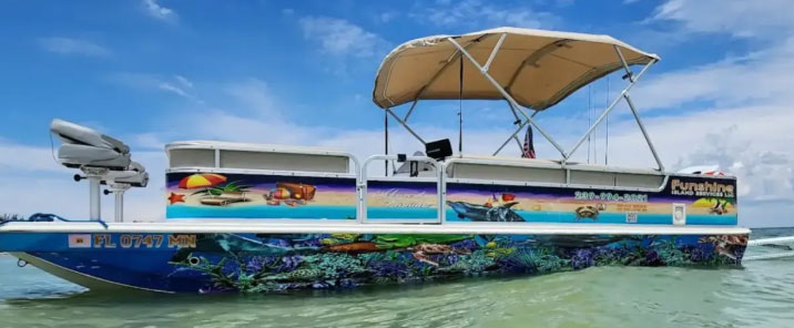 offers fishing charters, beach, sunset, and shelling tours, and private water taxis.