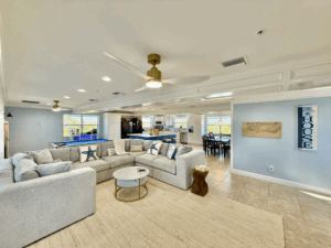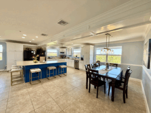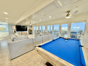 Second Floor: The heart of the home with a gourmet kitchen featuring stainless steel appliances, dual French door refrigerators, reverse osmosis water filtration, and everything from coffee makers to crockpots. The dining area offers seating for large gatherings, while the great room boasts a spacious sectional, 85” Smart TV, pool table, darts, and a nugget ice machine with full barware. A screened porch extends the living space with high-top dining, bistro table, and rocking chairs.