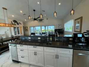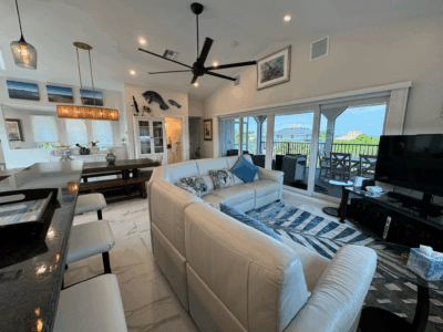 Inside, the heart of the home is an open-concept living area filled with light and island charm. The kitchen is stylish, functional, and beautifully appointed—perfect for cooking casual meals or enjoying takeout from the island’s restaurants. A spacious indoor dining table seats eight, and a large sectional provides the perfect spot for movies, games, or evening conversation. A covered Gulf-view lanai is just off the great room—ideal for morning coffee or sunset drinks.